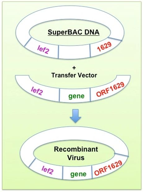 The superBAC DNA, is derived from a wild type AcMNPV genome, contains an ORF 1629 partial deletion which prevents non-recombinant virus from replicating in insect cells. In addition, superBAC DNA provides a positive selection for creating baculovirus recombinants in preparation for generating recombinant protein expression in insect cells. The kit improves on the traditional method for generating recombinant baculoviruses by eliminating the tedious, time-consuming steps of plaque purification.